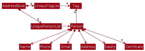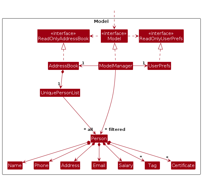Person objects (which are contained in a UniquePersonList object).Person objects (e.g., results of a search query) as a separate filtered list which is exposed to outsiders as an unmodifiable ObservableList<Person> that can be 'observed' e.g. the UI can be bound to this list so that the UI automatically updates when the data in the list change.UserPref object that represents the user’s preferences. This is exposed to the outside as a ReadOnlyUserPref objects.Model represents data entities of the domain, they should make sense on their own without depending on other components)Note: An alternative (arguably, a more OOP) model is given below. It has a Tag list in the AddressBook, which Person references. This allows AddressBook to only require one Tag object per unique tag, instead of each Person needing their own Tag objects.