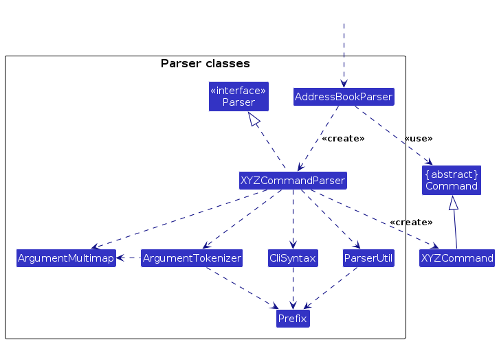 AddressBookParser class creates an XYZCommandParser (XYZ is a placeholder for the specific command name e.g., AddCommandParser) which uses the other classes shown above to parse the user command and create a XYZCommand object (e.g., AddCommand) which the AddressBookParser returns back as a Command object.XYZCommandParser classes (e.g., AddCommandParser, DeleteCommandParser, ...) inherit from the Parser interface so that they can be treated similarly where possible e.g, during testing.API : Model.java