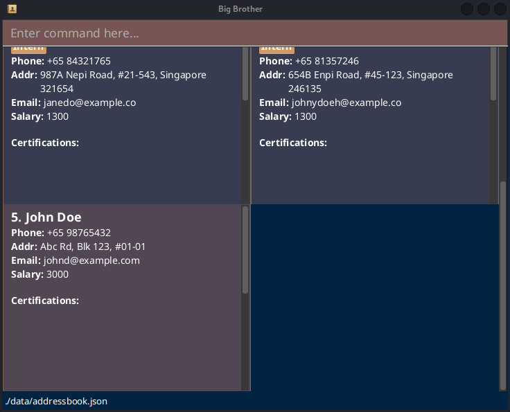 Big Brother is a desktop app for Human Resources to manage employee contacts, optimized for use via typing in a Command Line Interface (CLI) command box, while displaying the contacts efficiently via a Graphical User Interface (GUI).