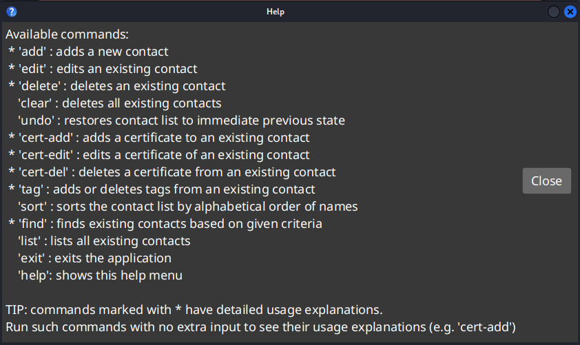 list followed by delete 2 deletes the 2nd person in the address book.find n/Betsy followed by delete 1 deletes the 1st person in the results of the find command, if present.findFormat: find [n/NAME] [t/TAG] [c/CERT_NAME] [e/CERT_EXPIRY_DATE]